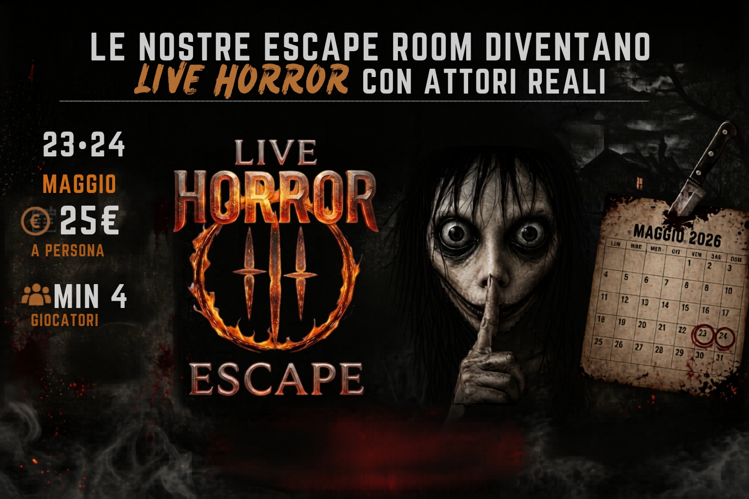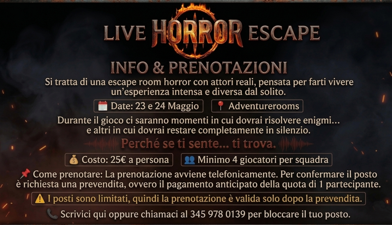 Il tuo nome (richiesto) La tua email (richiesto) Oggetto Il tuo messaggio Cliccando su Invia dichiaro di aver letto e accettato l'Informativa Privacy Una volta effettuata la prenotazione sul sito sarà necessario acquistare una prevendita di 25 euro in loco presso la nostra sede, o online alle seguenti cordinate: Paypal info@adventurerooms.it soluzione amici e parenti Indicare nella causale giorno, fascia oraria, e nome di chi ha prenotato Bonifico Bancario di seguito le coordinate bancarie (IBAN) del conto corrente presso UniCredit intestato a FIORENZA MARIA GRAZIA: IT04Y0200883620000102752560 Paese: IT CIN/EU: 04 CIN/IT: Y ABI: 02008 CAB: 83620 Numero C/C: 00000102752560 BIC/SWIFT: UNCRITM1H79. Se entro 72 ore dall’avvenuta prenotazione non verrà acquistata la prevendita, la vostra prenotazione verrà automaticamente cancellata. Per l’evento non sarà possibile riscattare nessuno sconto, inclusa la fidelity card Per qualsiasi dubbio o informazione restiamo disponibili su info@firenze.adventurerooms.it o su WHATSAPP al numero +39 3459780139! Fuga dal manicomio II Fuga dal manicomio II INCUBO INCUBO